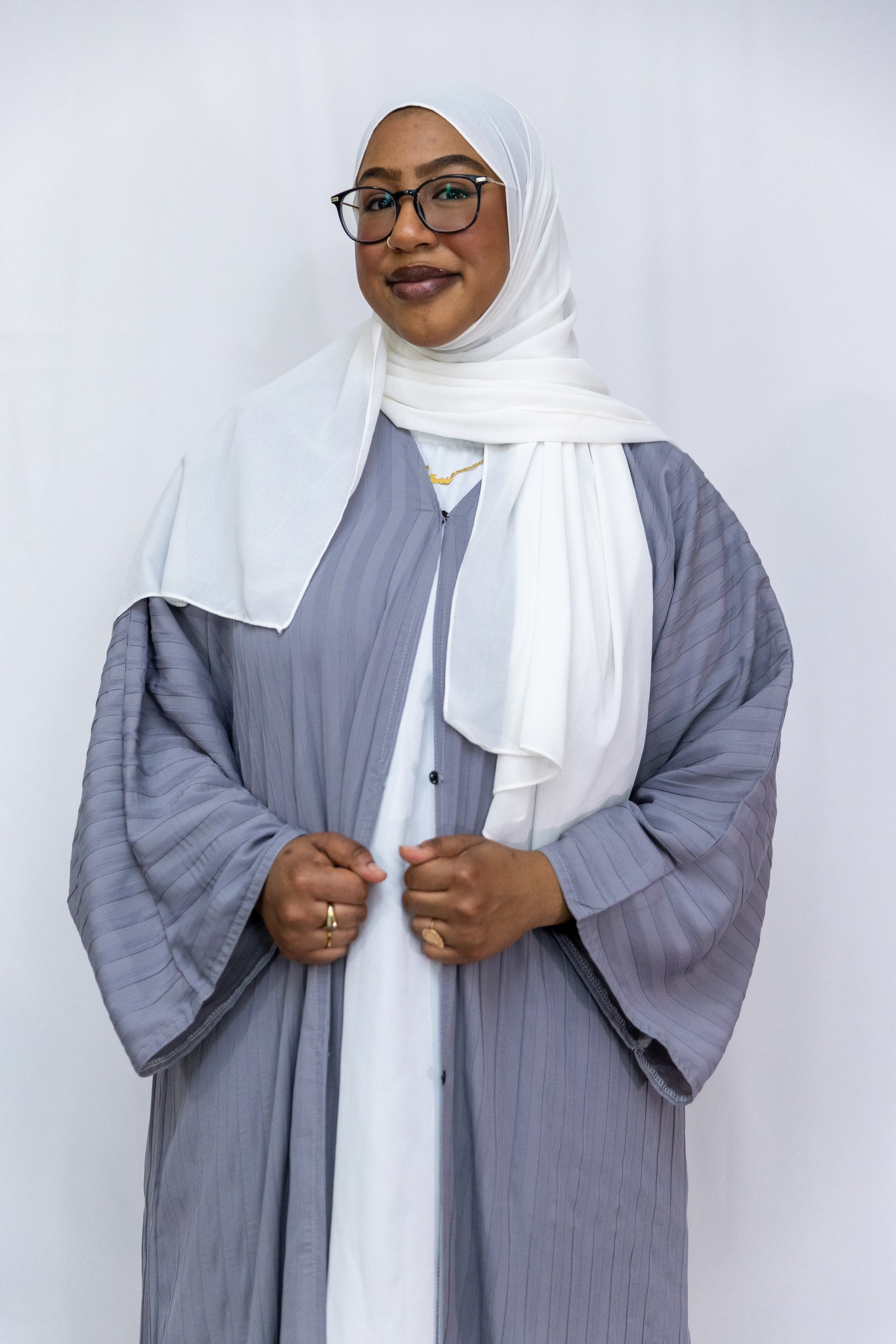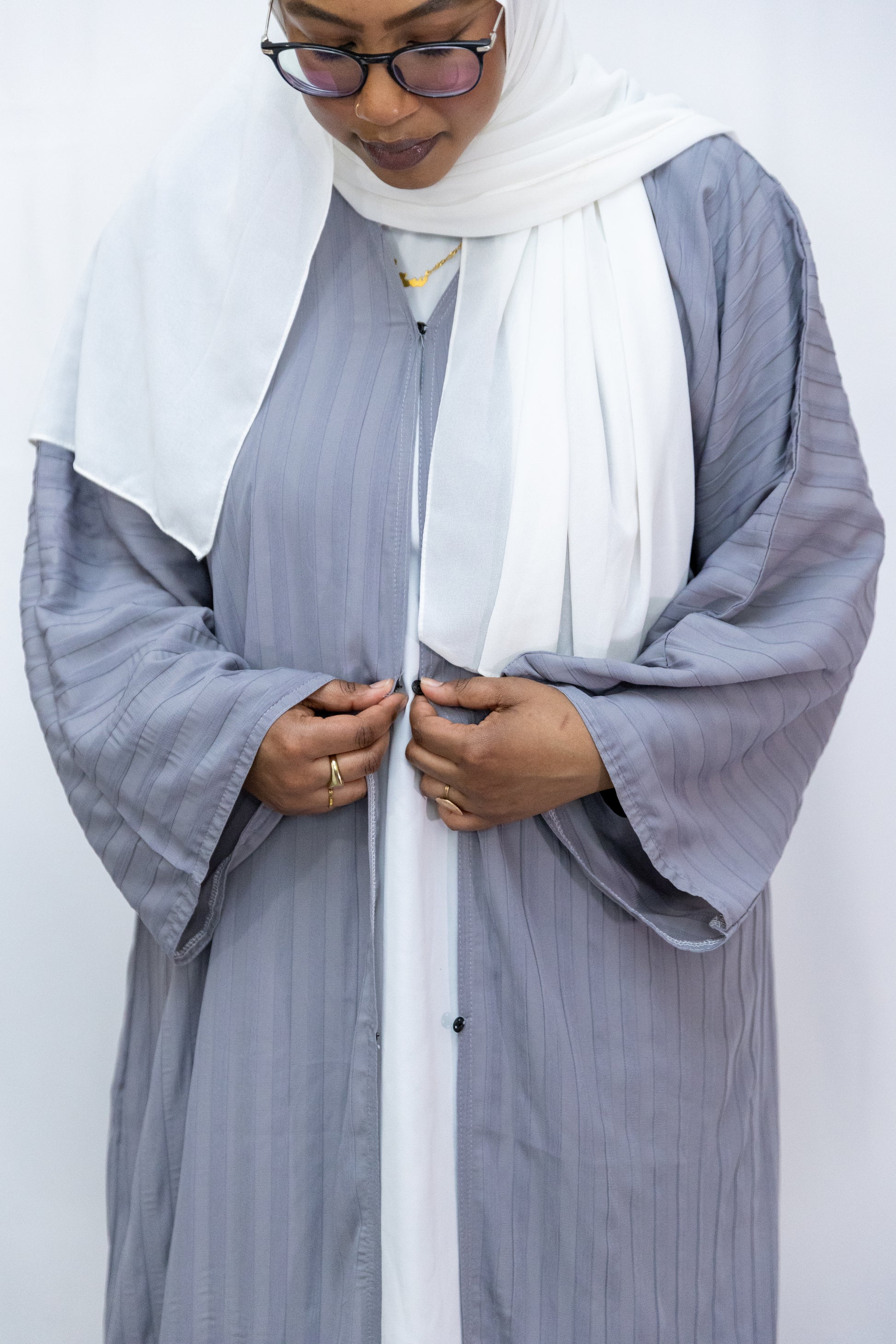 This open striped abaya features delicate detailing and convenient front clasps for a secure and elegant fit. Made from lightweight, flowy fabric, it drapes beautifully while offering comfort and sophistication. Perfect for layering, this abaya adds a refined touch to any outfit, making it ideal for both casual and formal occasions.
