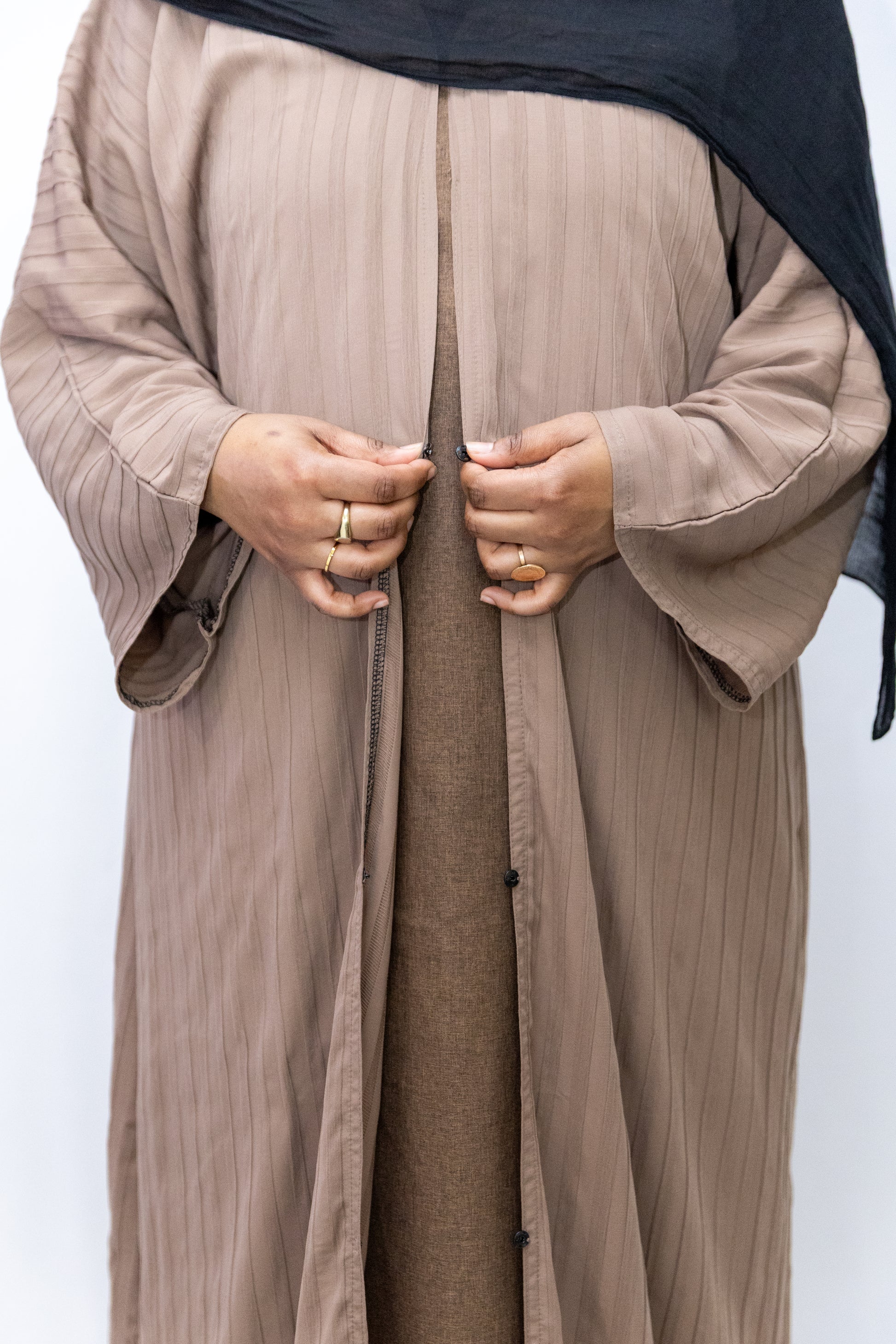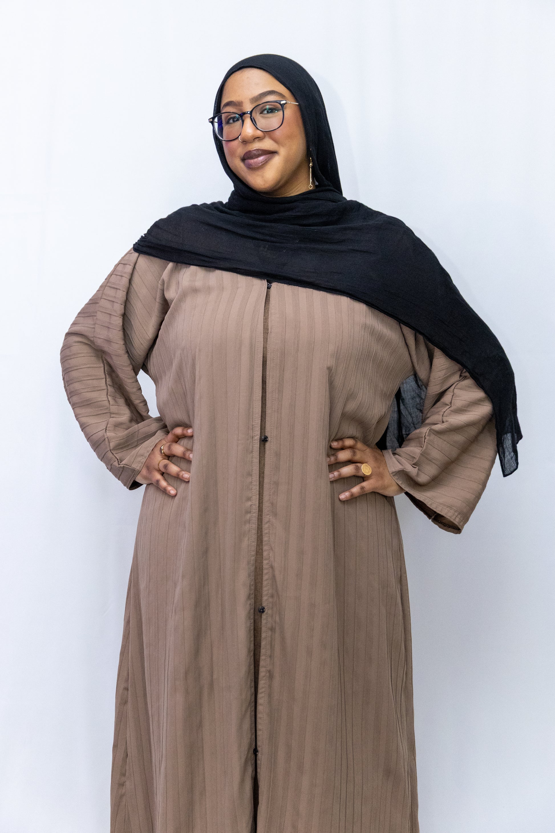 This open striped abaya features delicate detailing and convenient front clasps for a secure and elegant fit. Made from lightweight, flowy fabric, it drapes beautifully while offering comfort and sophistication. Perfect for layering, this abaya adds a refined touch to any outfit, making it ideal for both casual and formal occasions.