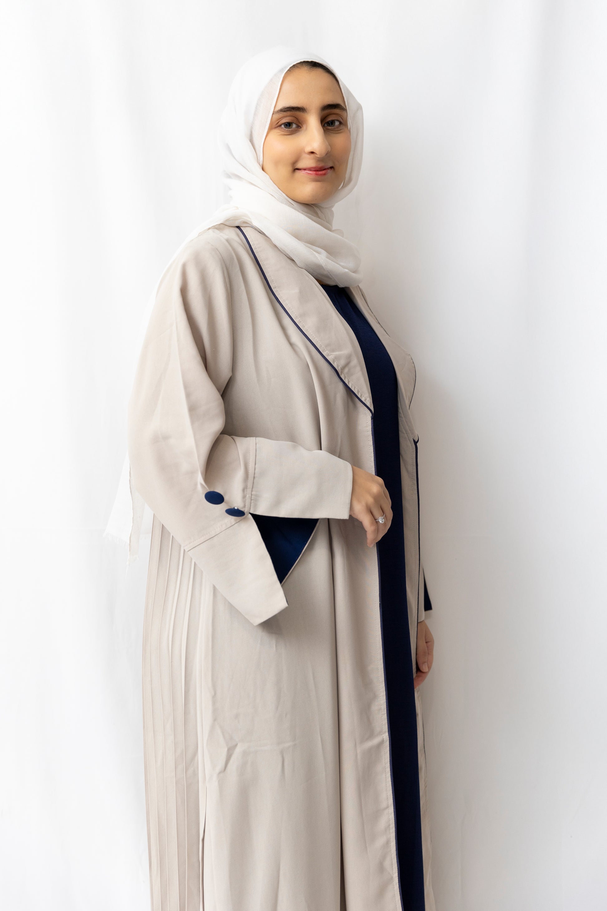 This collared abaya features a sleek, structured design with a sophisticated touch. The pleated back adds graceful movement and a flowy silhouette, combining elegance with comfort. Made from lightweight fabric, it offers a polished look perfect for both everyday wear and special occasions.